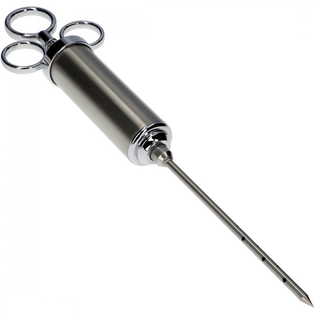 Solid marinadesprøyte i rustfritt stål med kapasitet på 60 ml, egnet for injisering av marinade og saltlake i kjøtt og fisk. Leveres med to nåler – én for tykkere marinader med krydderbiter og én for jevn og rask fordeling av mer flytende marinader.