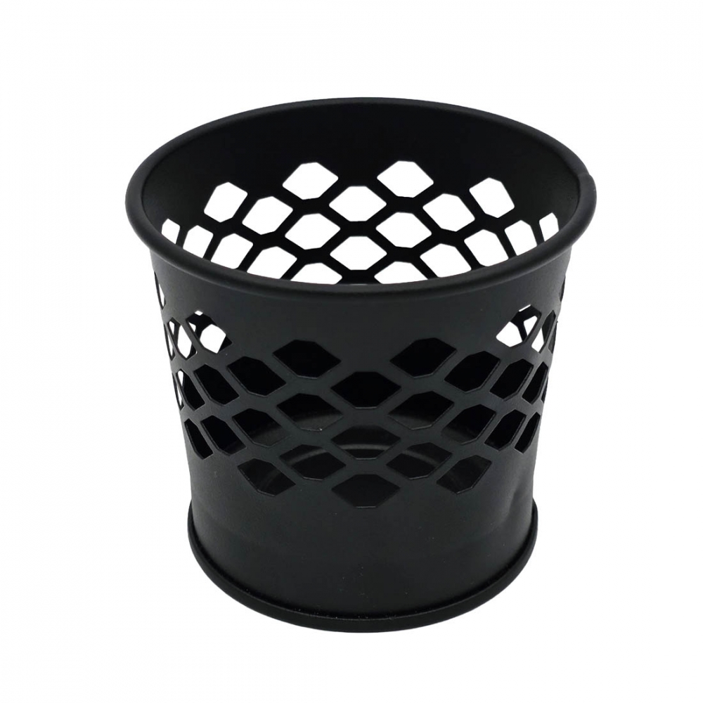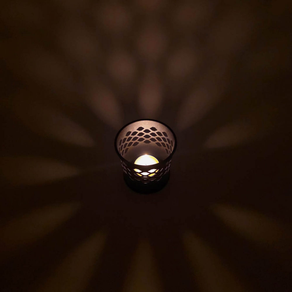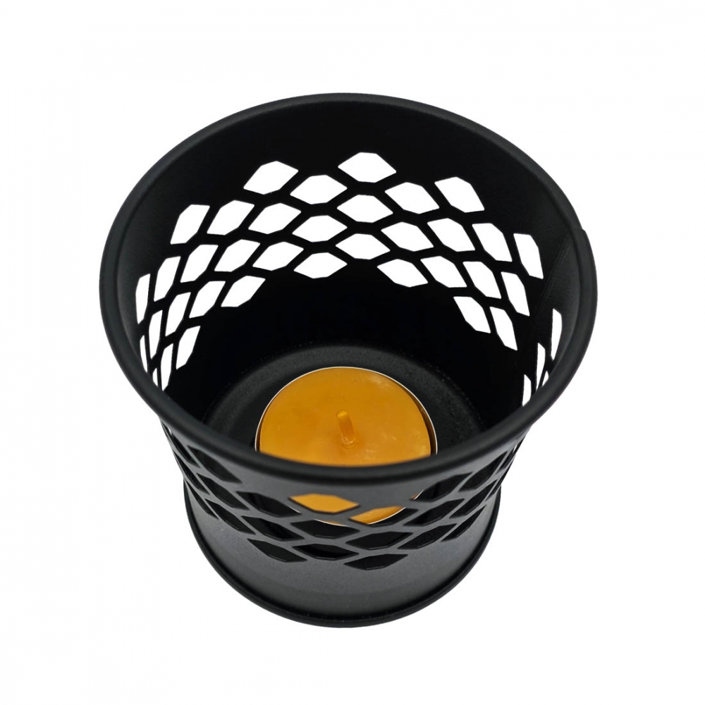 Svart lysholder i metall med dekorativt, gjennombrutt mønster som sprer lyset på en stemningsfull måte. Passer til telys og mindre kubbelys.