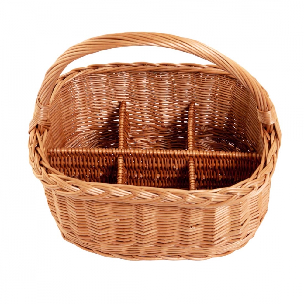 Flettet flaskekurv med håndtak - robust og romslig. Håndlaget av slitesterk, naturlig pil med plass til seks flasker eller glass. Perfekt til piknik, grillfest, hagekos eller som dekorativ oppbevaring på kjøkken eller i stue. Tidløs og funksjonell design.