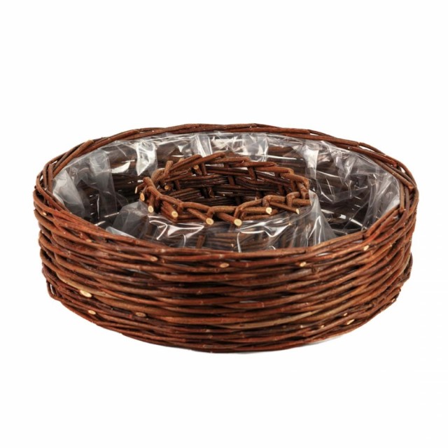 Rund kurvpotte i naturlig, ubarket og holdbar pil, i form av en krans og med plastfolie på innsiden. Perfekt til sommerblomster, urter eller små planter på balkong, terrasse eller i hagen. Kurven egner seg også godt til kreative blomsterarrangementer og dekorasjoner med friske eller tørkede blomster. Et rustikt uttrykk som skaper en lun stemning.