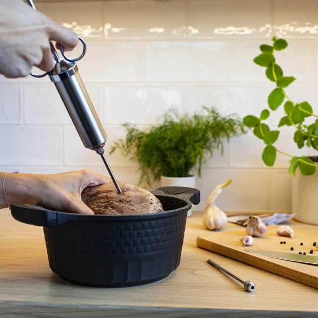 Sprøyten gjør det enklere å oppnå jevnt kryddet, saftig og velsmakende kjøtt. Egner seg godt til speking og marinering av kjøtt, fisk, grønnsaker og andre spekevarer. Utførelsen i rustfritt stål er trygg for kontakt med mat, slitesterk og beregnet for langvarig bruk.
