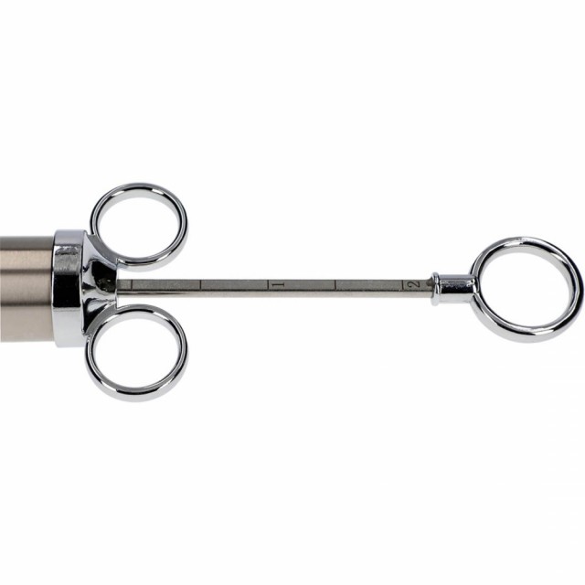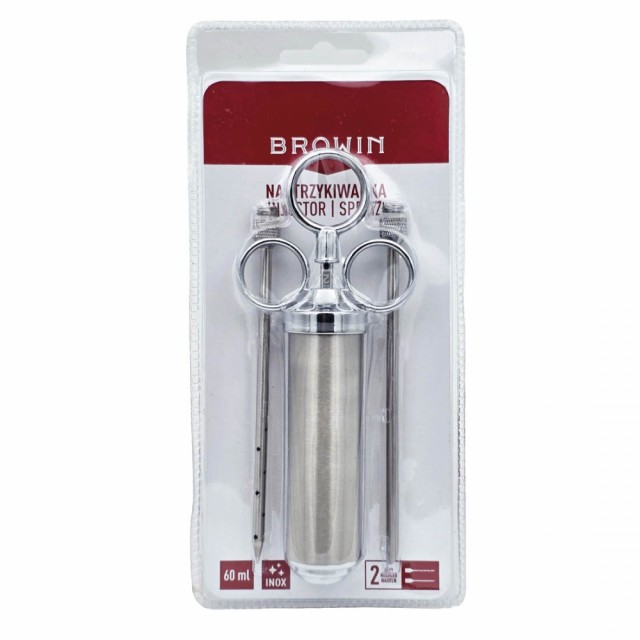 Solid marinadesprøyte i rustfritt stål med kapasitet på 60 ml, beregnet for injisering av marinade og saltlake i kjøtt og fisk. Leveres med to forskjellige nåler.
