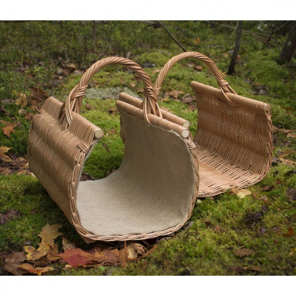 Flettet vedkurv med håndtak – "Ulf". Håndlaget av slitesterk pil, romslig og egnet for vedkubber på 60 cm. Perfekt for oppbevaring og transport av fyringsved ved peisen. Funksjonelt og koselig tilskudd til ethvert hjem med ildsted. Med/uten lintrekk.